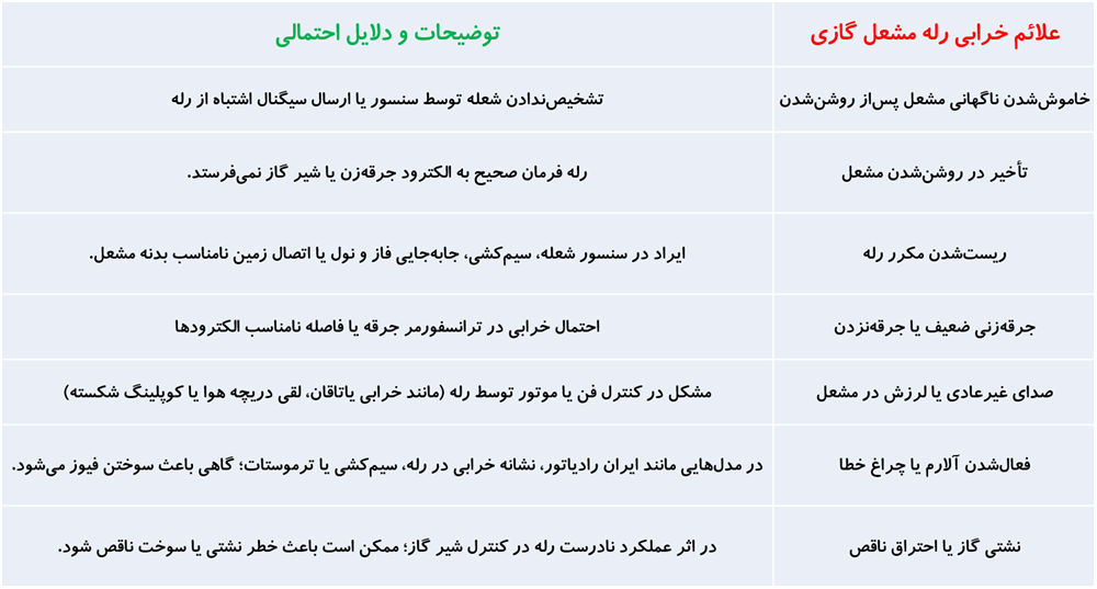 در بخش زیر علائم و نشانههای رایج خرابی رله مشعل گازی را همراه با دلایل احتمالی آنها بررسی کردهایم: