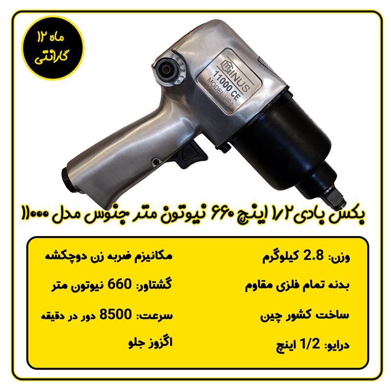 - بکس بادی جنوس 11000: تولید چین (هایکپی جنیوس 400500)، بدنه تمام فلزی، 12 ماه گارانتی + 36 ماه خدمات، گشتاور 660 نیوتنمتر، سرعت 8500 دور/دقیقه، مصرف هوا 140 لیتر/دقیقه، مناسب برای مکانیکی و آپاراتی.