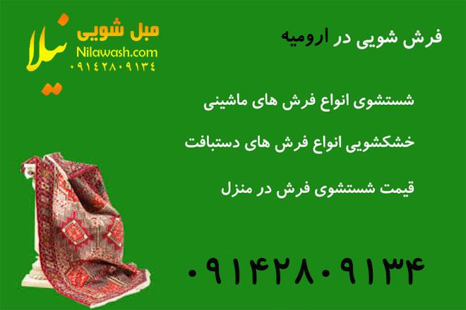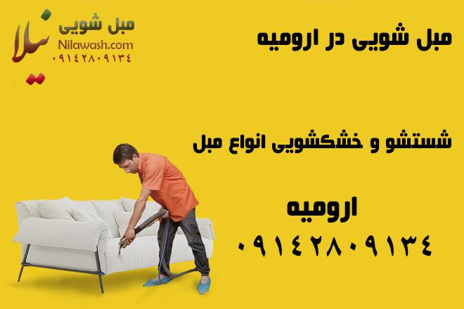 ما در شهرستان ارومیه یک شرکت معتبر و مجاز برای شستشوی مبل در منزل می باشیم. کلیه خدمات مبل شویی در ارومیه با دستگاه و با بهترین نوع مواد شوینده نانو با ضمانت انجام می شود. مبل های خود را در ارومیه به شرکت های معتبر و مجاز بسپارید تا شستشو دهند. مبل شویی نیلا دارای مجوز رسمی از اتحادیه مبلشویان ارومیه می باشد. ما در نزدیکی شما آماده ارائه خدمات ویژه هستیم. مبل های خود را به ما بسپارید.